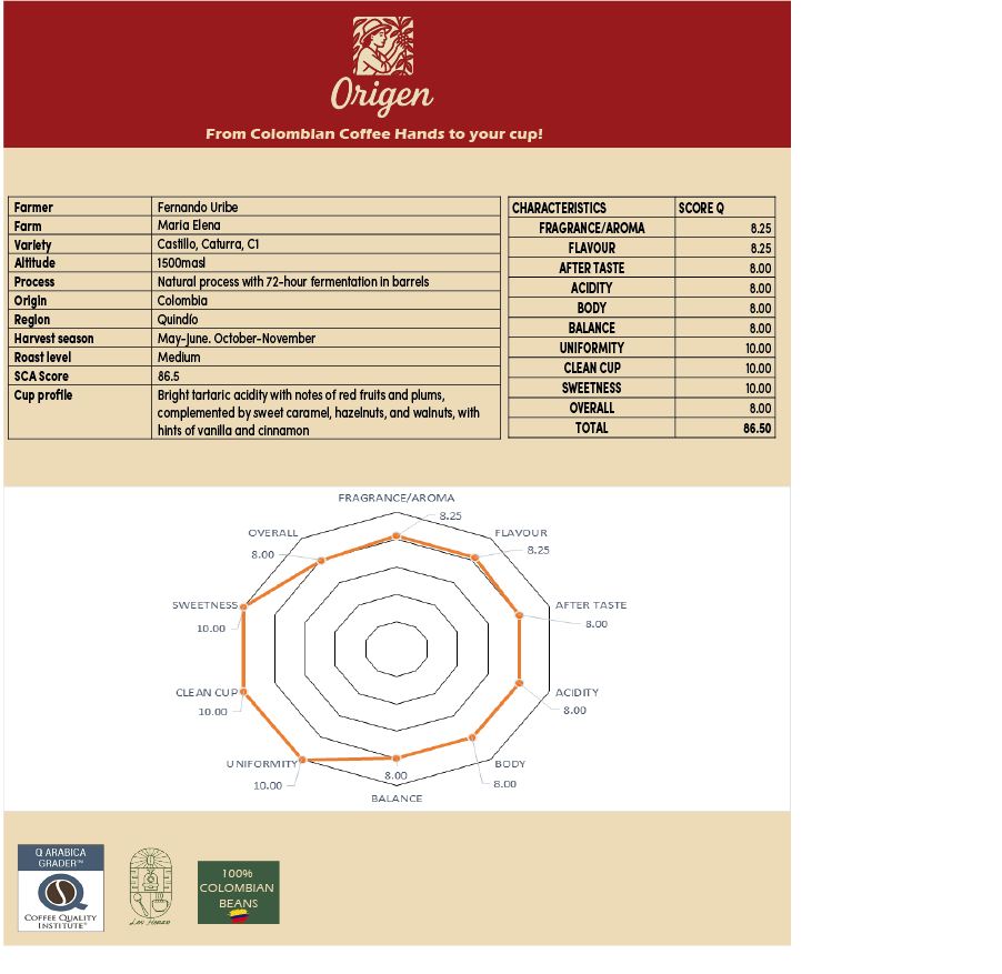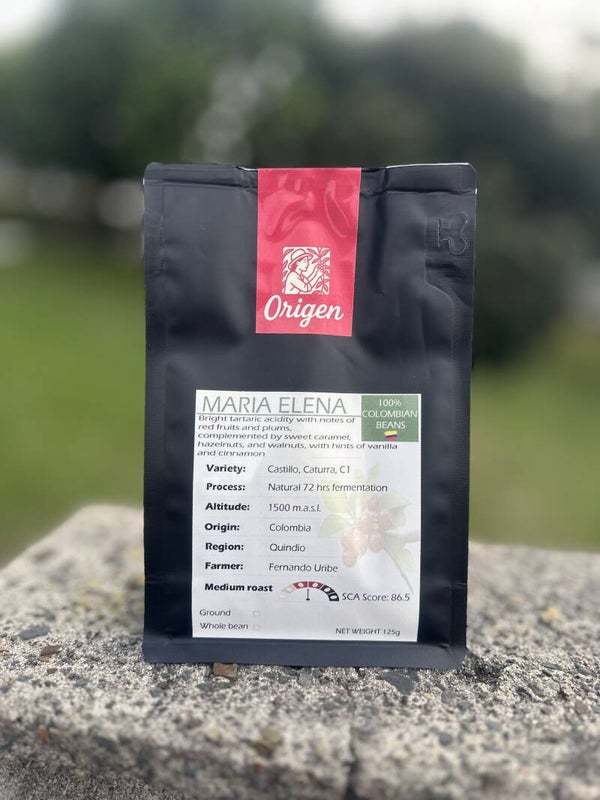 Today, the coffees from Finca María Elena reflect this philosophy. Grown at 1,500 meters above sea level and processed with 72 hours of natural fermentation, the beans develop a vibrant and expressive profile—bright tartaric acidity with notes of red fruits and plums, balanced by sweet caramel, hazelnut, walnut, vanilla, and cinnamon.